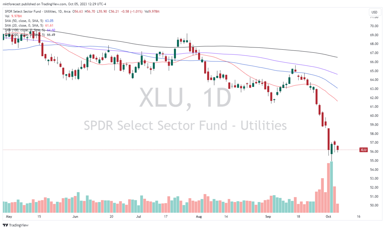 Enter the XLU or the spider utilities exchange trades fund. It’s basically a basket of debt ridden, slow growing utility companies. They’re VERY interest rate sensitive since the cost of borrowing was rising at a fast pace. They borrow a lot for plant and equipment to keep the lights on.