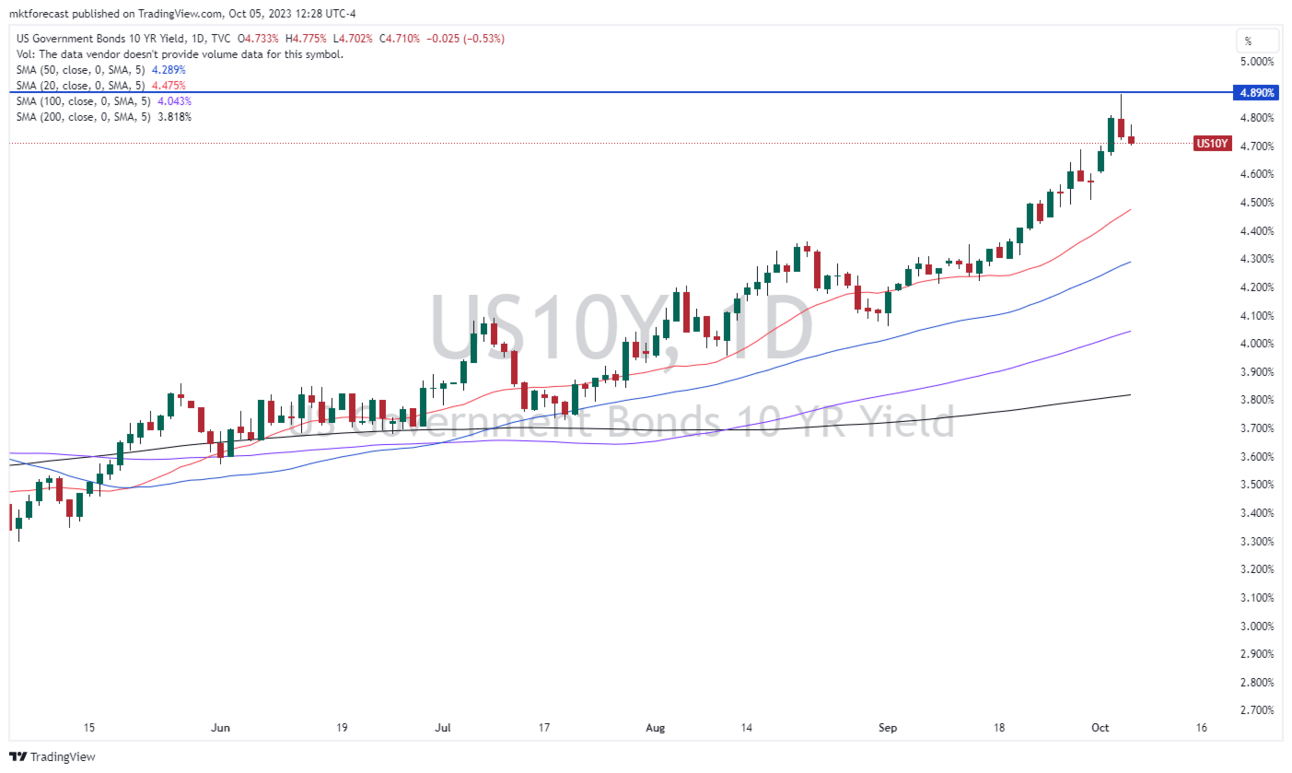 The next chart is the 10-year treasury yield again, showing a high on October 4th.