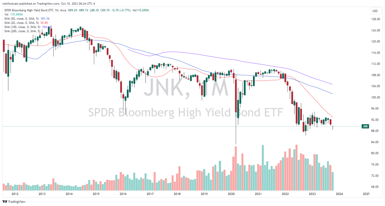 The chart below is JNK which is one of the exchange traded tracking funds for high yield debt.